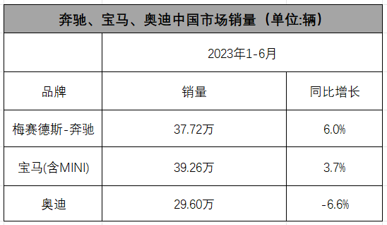 2023年上半年,奔驰宝马摆脱了下滑的趋势。官方数据显示,今年上半年,奔驰向中国市场交付量为37.72万辆,同比增长6%,宝马向中国市场交付量为39.26万辆,同比增长3.7%。奥迪的情况差了些,上半年在华销量为29.60万辆,同比下降6.6%。