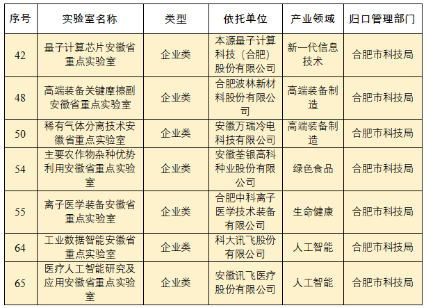 这次获评认定的分别是量子计算芯片安徽省重点实验室、高端装备关键摩擦副安徽省重点实验室、稀有气体分离技术安徽省重点实验室、主要农作物杂种优势利用安徽省重点实验室、离子医学装备安徽省重点实验室、工业数据智能安徽省重点实验室和医疗人工智能研究及应用安徽省重点实验室。