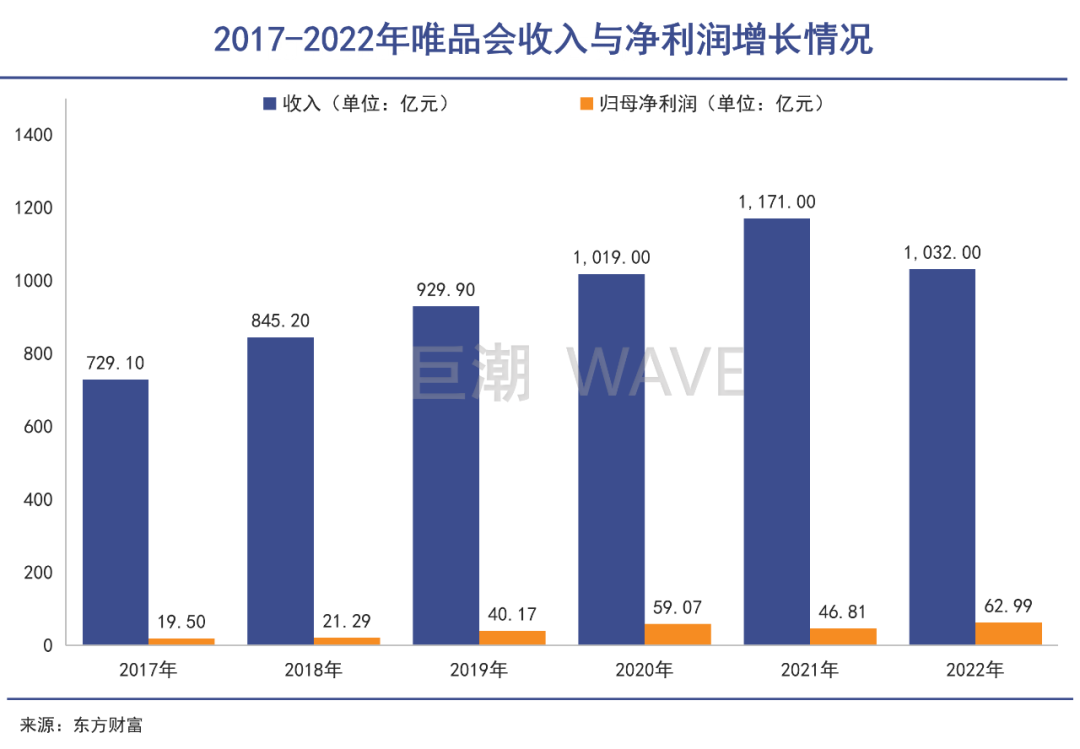 再向前追溯,自从2013年以来唯品会已经连续10年盈利,并且保持了净利润的逐年稳健增长,这是阿里和京东都没有做到的成绩。2017—2022年,唯品会的年收入由729亿元增长至1032亿元,增长仅41%。但是企业归母净利润由19.5亿元增长至62.99亿元,增长高达223%。
