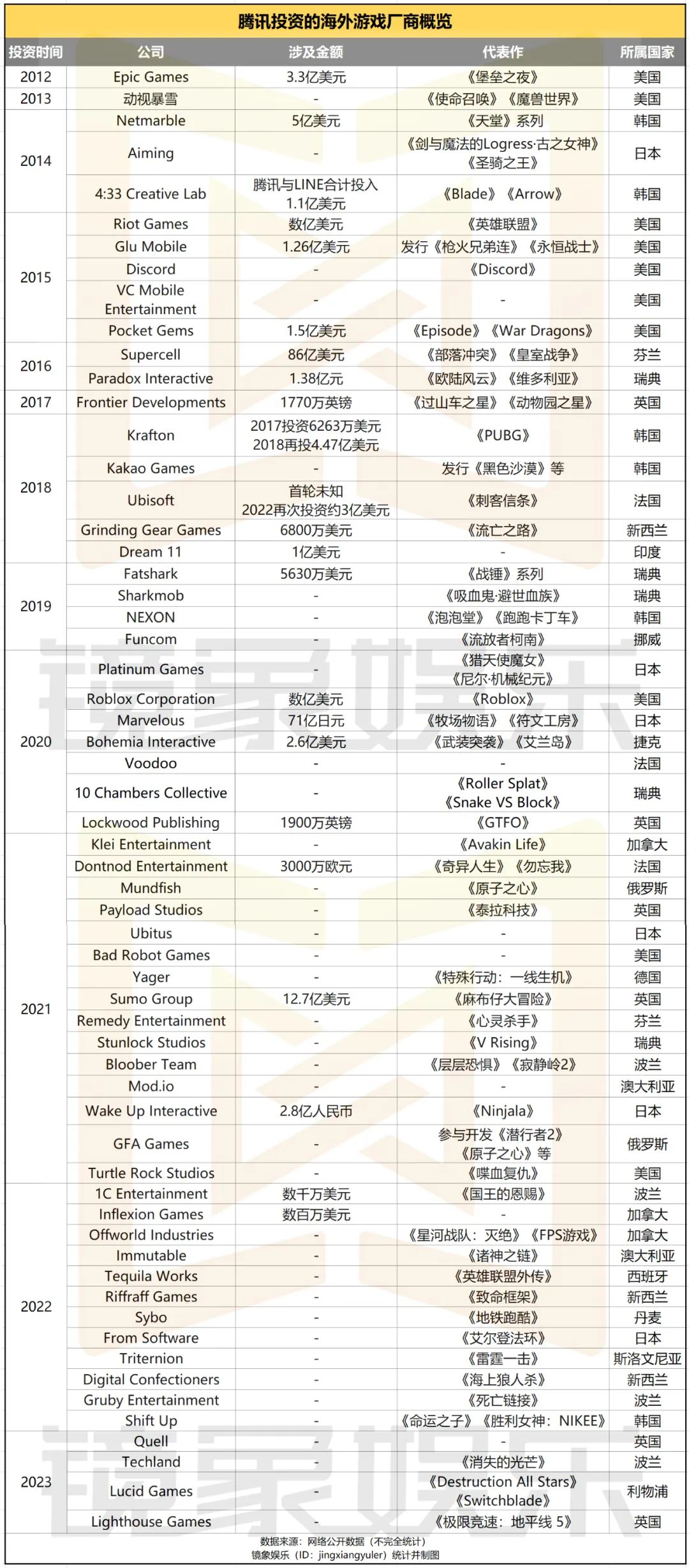 后来,腾讯在海外游戏市场的布局逐渐加快,根据中信证券2022年9月发布的研报数据,自2012年以来,腾讯至少耗费978.67亿元,投资了33家海外游戏公司。而今,这一数据还在迅速扩大,据镜象娱乐不完全统计,截至目前,腾讯投资的海外游戏厂商在60家左右。