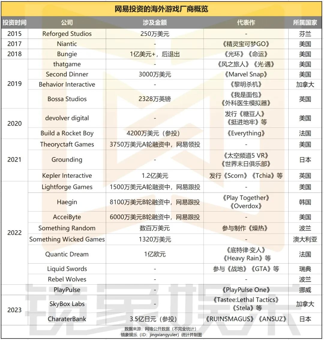 相比之下,网易向海外游戏厂商出手大约是在2015年前后。并且,相较于腾讯大面积铺开、广撒网的模式,网易的步子相对要小一些,据镜象娱乐不完全统计,截至目前,网易投资的海外游戏厂商约在20家左右。