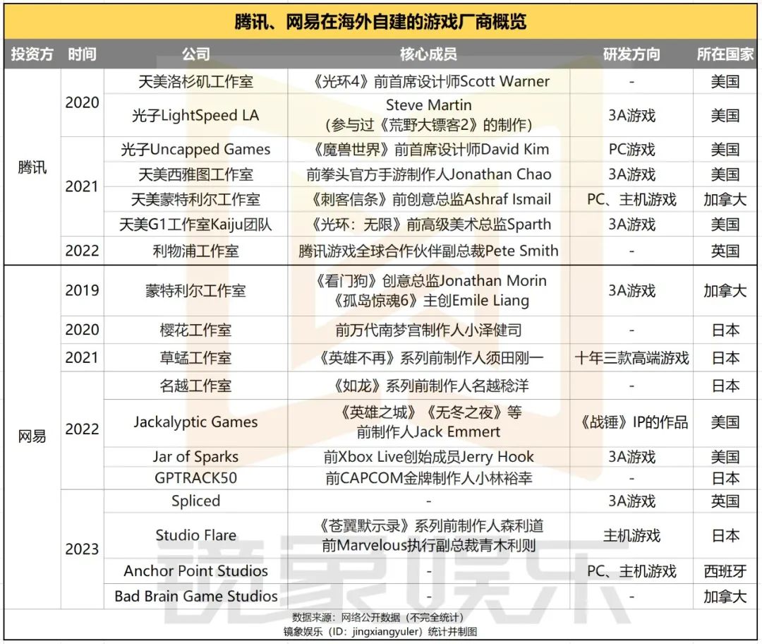 更值得关注的是,2020年以来,腾讯、网易也着手在海外市场建立自己的游戏工作室,这些工作室或与海外的优质团队合作,或直接引入海外经验丰富的游戏研发者,研发方向同样以3A游戏、主机游戏为主。