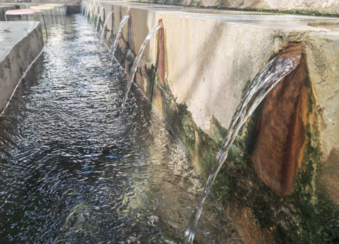 一米多高的水柱从山间石缝里喷涌而出,水汽带着硫磺味扑面而来。而后,热水顺着管道,流向温泉池,等待游客们的光临。