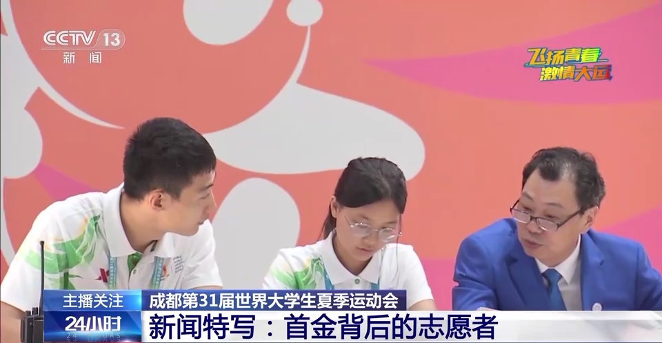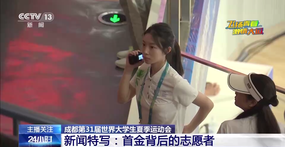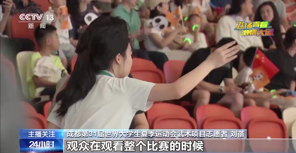 成都第31届世界大学生夏季运动会武术项目志愿者 刘蓓:作为我们整个大运会首金,我作为一个中国人非常的骄傲和自豪。我听到他们一阵又一阵的欢呼声,其实我心里是非常激动的,我也非常想转回去看一下,但是因为我自己的职责的原因,所以我不能回头去观看。作为赛事的志愿者最重要一点,一定要保证观众在观看整个比赛的时候,能够得到相对应的需求保障,在重要的场合需要做出对应的事情。
