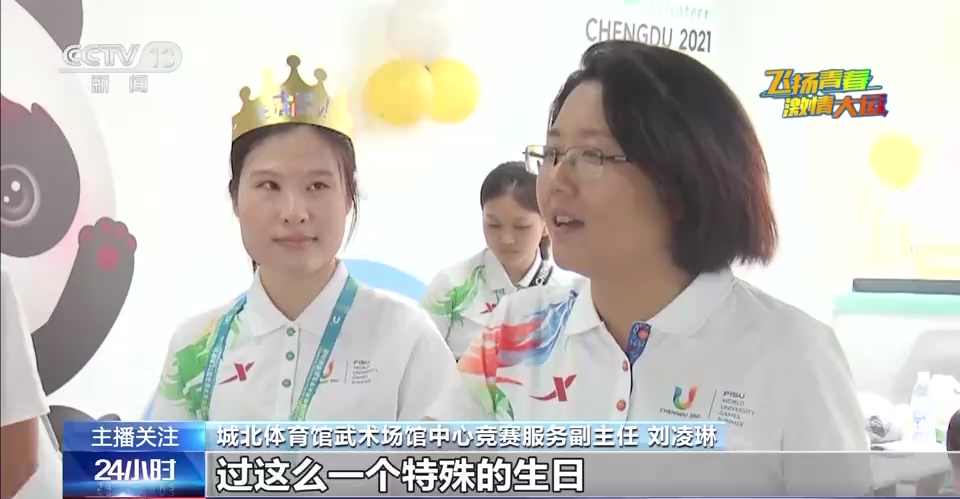 城北体育馆武术场馆中心竞赛服务副主任 刘凌琳:在特定的时候,在特定的身份,过这么一个特殊的生日,我们希望你们能以这个生日记忆一生。我也希望参与过大运会武术比赛服务的所有志愿者,也能记住这一天,因为你们在一个有爱的团队里面生活着。