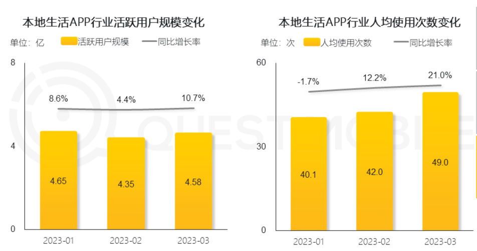 Quest Mobile数据显示,2023年3月,本地生活行业迎来复苏,在活跃用户规模以及使用次数等方面较2022年同期均有明显提升。移动互联网细分行业活跃渗透率中,本地生活已经达到37.9%,仅次于地图导航、支付结算和手机银行。