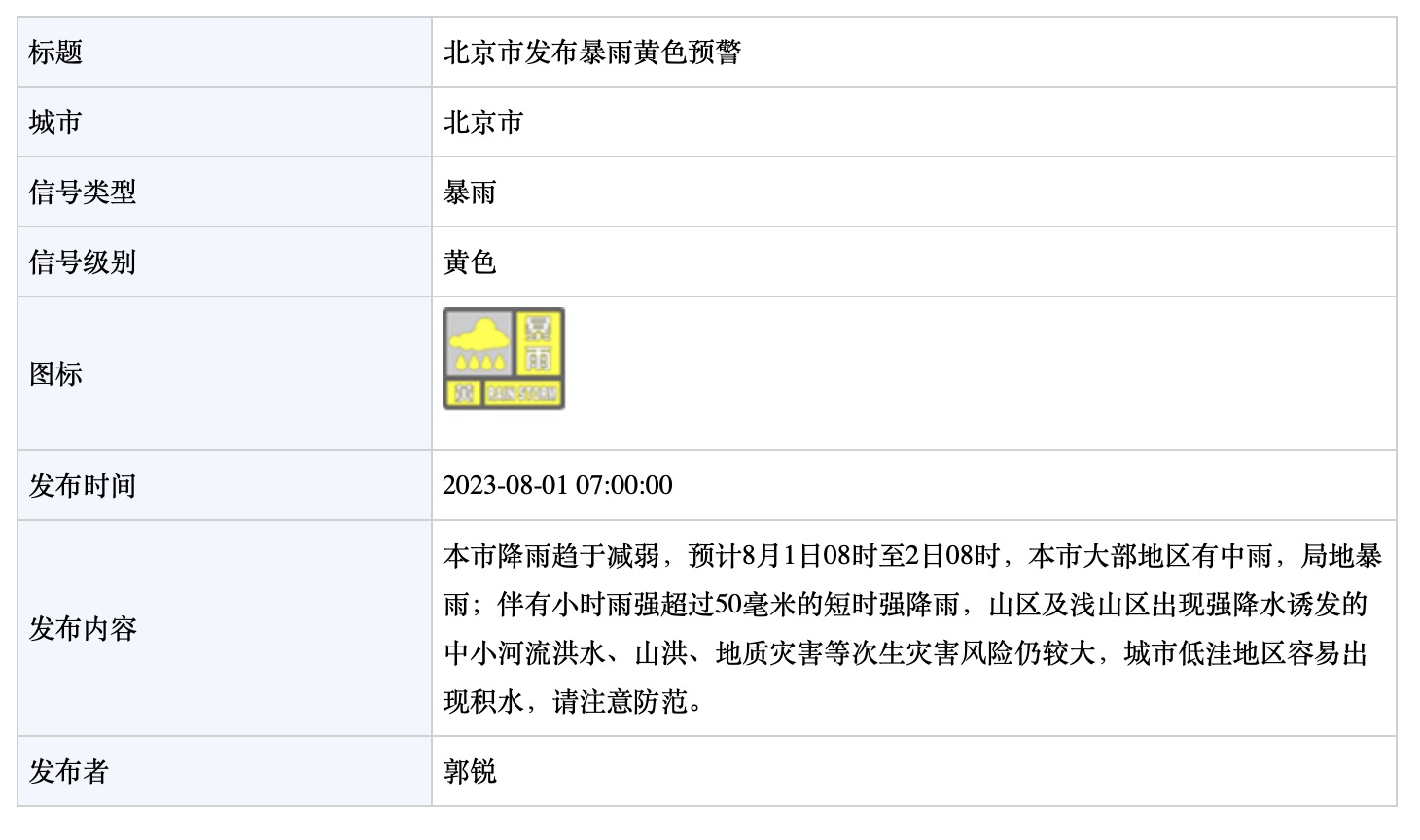 据北京市气象局,北京市发布暴雨黄色预警:本市降雨趋于减弱,预计8月1日08时至2日08时,本市大部地区有中雨,局地暴雨;伴有小时雨强超过50毫米的短时强降雨,山区及浅山区出现强降水诱发的中小河流洪水、山洪、地质灾害等次生灾害风险仍较大,城市低洼地区容易出现积水,请注意防范。