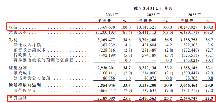 数据显示,2021财年至2023财年(以下简称“报告期内”)银龙供水营收分别为84.70亿港元、101.47亿港元、102.48亿港元,同期公司利润分别为21.89亿港元、24.01亿港元、23.45亿港元,银龙供水出现增收不增利的情况。
