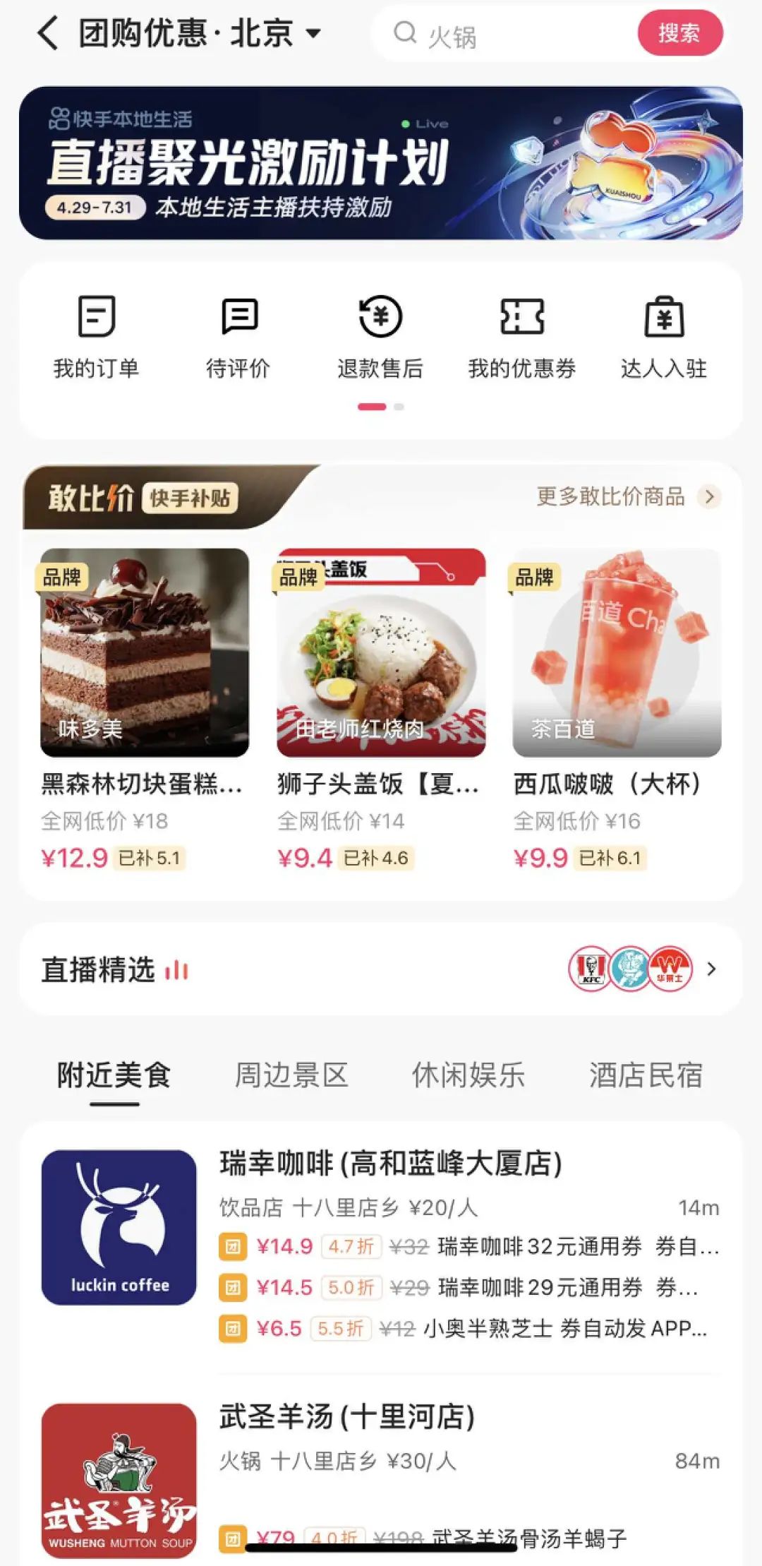 打开快手APP的“团购优惠”界面,能看到“敢比价”活动。这是快手今年7月开始的官方补贴活动,主打低价。