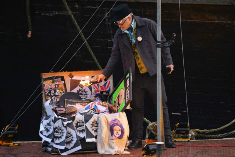 6、7度的伦敦深秋,阿尔伯特桥两岸站着200多名拥护者和闻风而来的媒体,他们静静等待发起人点燃火炬。顷刻间,音乐专辑、海报,以及由庞克音乐衍生而出的时装被付之一炬,估值500万-1000万英镑之间。