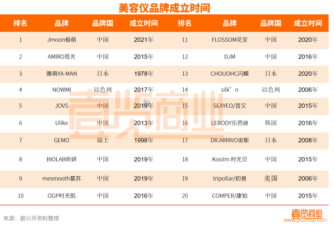 20家品牌中国外品牌共有8家占品牌总量40%,国内品牌共有12家占总量60%。从国外品牌创立时间来看,成立时间最久的品牌为雅萌至今已有45年历史,成立时间最短的为CHOUOHC闪蝶仅有3年历史,国外品牌大多成立于2010年以前,在国外品牌中有5家品牌成立于2010年以前,他们分别是,日本品牌雅萌(1978年)、瑞士品牌GEMO(1998年)、以色列品牌silk’n(2006年)、美国品牌初普(2006年)、日本品牌DR.ARRIVO宙斯(2008年),2010年以后诞生的品牌有三个,分别是韩国品牌LEBODY乐芭迪(2016年)、以色列品牌NOWMI那魅(2017年)、日本品牌CHOUOHC闪蝶(2020年),国外平均成立时间约为16年。