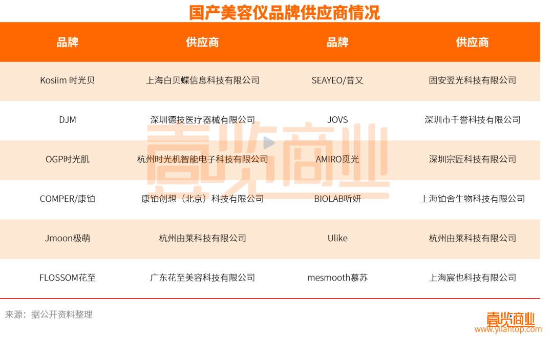 除了8家原装进口的品牌外,12个国产美容仪品牌中,共有11个供应商,其中极萌与Ulike同属于一家公司即杭州由莱科技,因此两家供应商也都为杭州由莱科技。