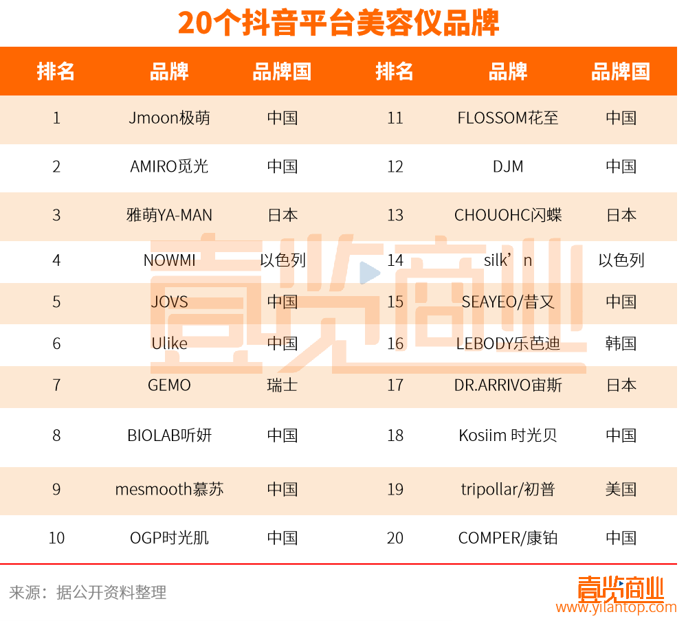 基于以上原因,壹览商业研究了近一个月在抖音平台上销售TOP20的美容仪品牌,发现了这个行业的几个秘密。