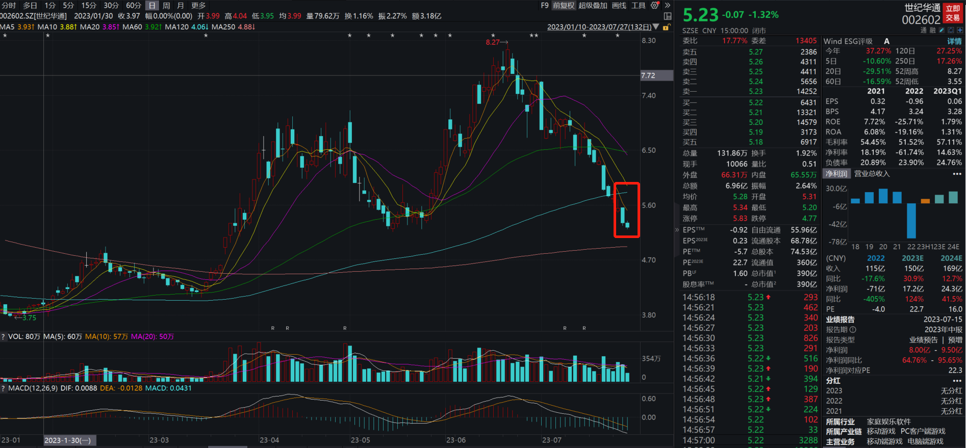 反映在资本市场上,次日世纪华通收跌2.8%,此后延续下滑的趋势,27日股价报收5.23元/股,市值跌破400亿大关,目前390亿元。