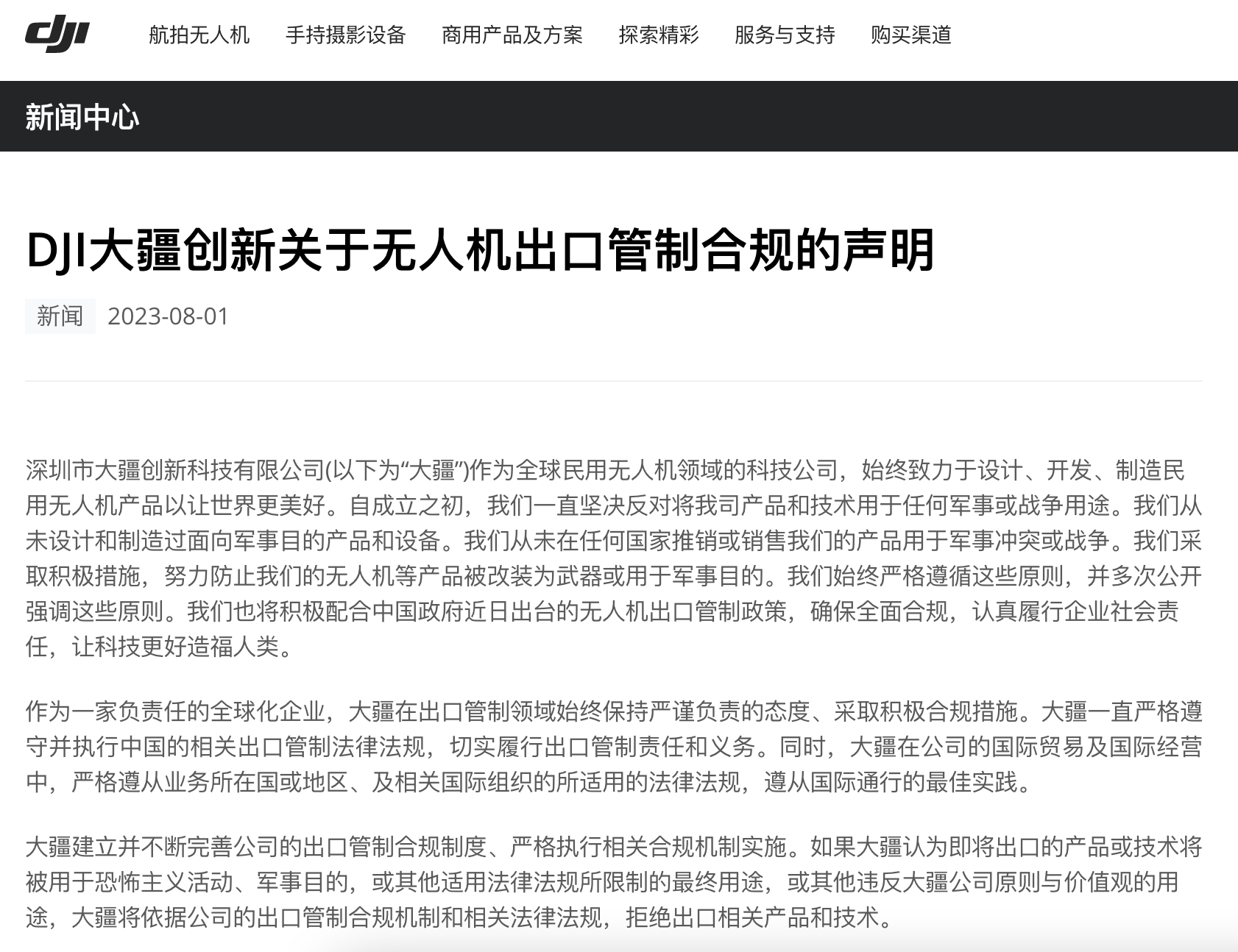 8月1日,大疆发布声明称:自成立之初,我们一直坚决反对将我司产品和技术用于任何军事或战争用途。我们从未设计和制造过面向军事目的产品和设备。我们从未在任何国家推销或销售我们的产品用于军事冲突或战争。我们采取积极措施,努力防止我们的无人机等产品被改装为武器或用于军事目的。我们始终严格遵循这些原则,并多次公开强调这些原则。我们也将积极配合中国政府近日出台的无人机出口管制政策,确保全面合规,认真履行企业社会责任。