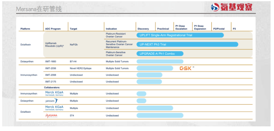 最后,是大药企的背书。基于技术平台,Mersana搭建了极为丰富的管线。这些管线也成功吸引到大药厂的目光。