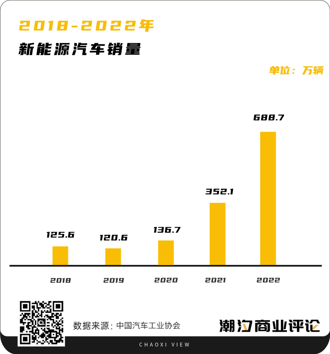 事实上,消费者对新能源汽车从谨慎观望到主动拥抱,仅仅经历了2年时间。从2018年到2020年,彼时,国内新能源汽车的年销量为一百多万辆。直到2021年,新能源汽车的需求量正式爆发,2021年新能源汽车销量达352.1万辆,一年增长了近200万辆,到了2022年更是翻倍。