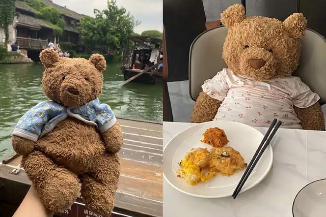 今年夏天,悦纯带着自己的“娃”——四喜,一只“巴塞罗熊”游遍了江浙沪,还在自己的小红书账号写道,“四喜旅行集邮,到了乌镇和苏州园林。真的会被热死在真江南。”