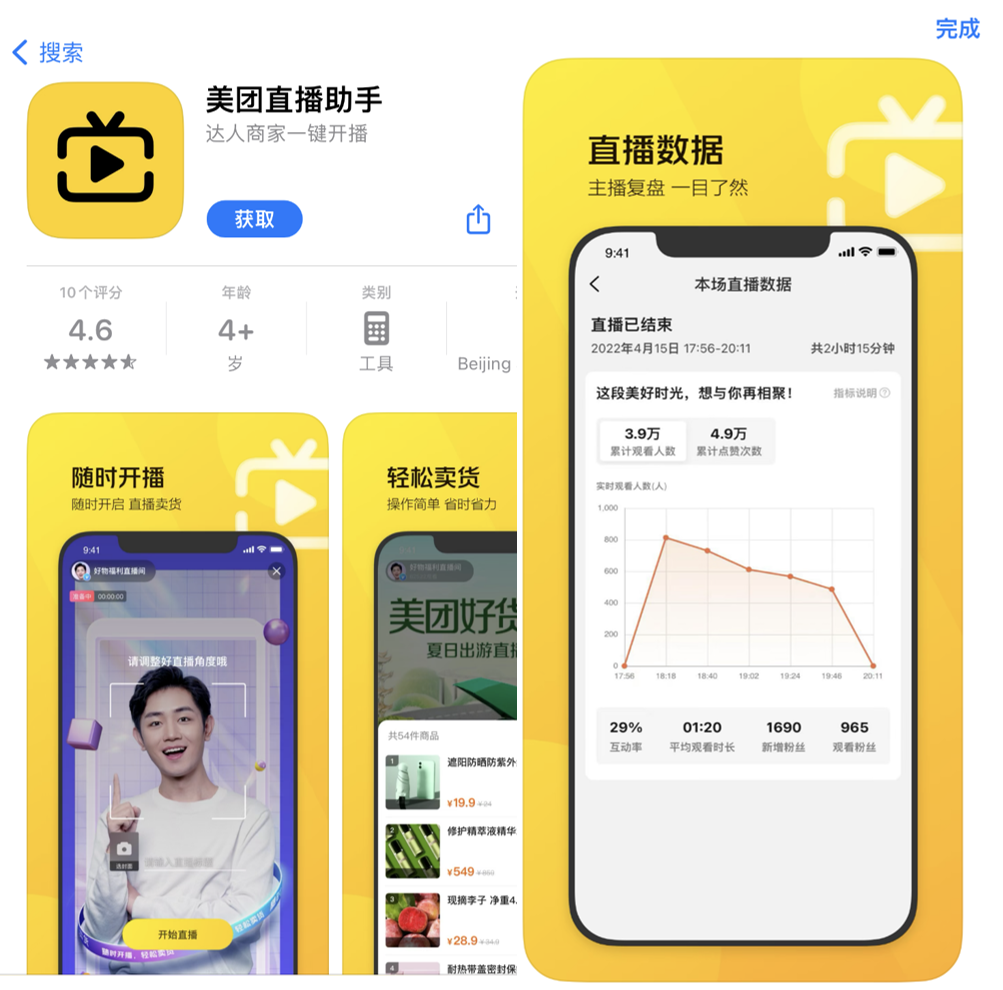今年以来,美团更是在直播领域动作频频。4月,推出“美团直播助手”APP,服务商家和达人的开播,功能主要有直播预告、轻松卖货和一键开播,相比小程序完善不少。不过《天下网商》观察到,这款应用下载量并不大,目前在APP Store仅有10个评分。