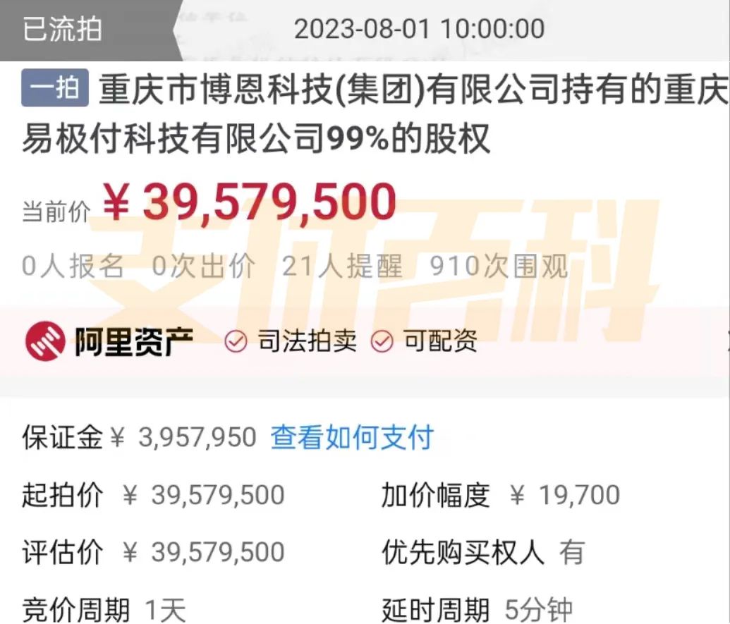 易极付是重庆市为数不多的支付机构之一,注册资本1亿元,法人为曲国宁,大股东是重庆市博恩科技(集团)有限公司(以下简称“博恩科技”),持有易极付99%的股权,此次法院拍卖的就是博恩科技持有易极付99%的股权。