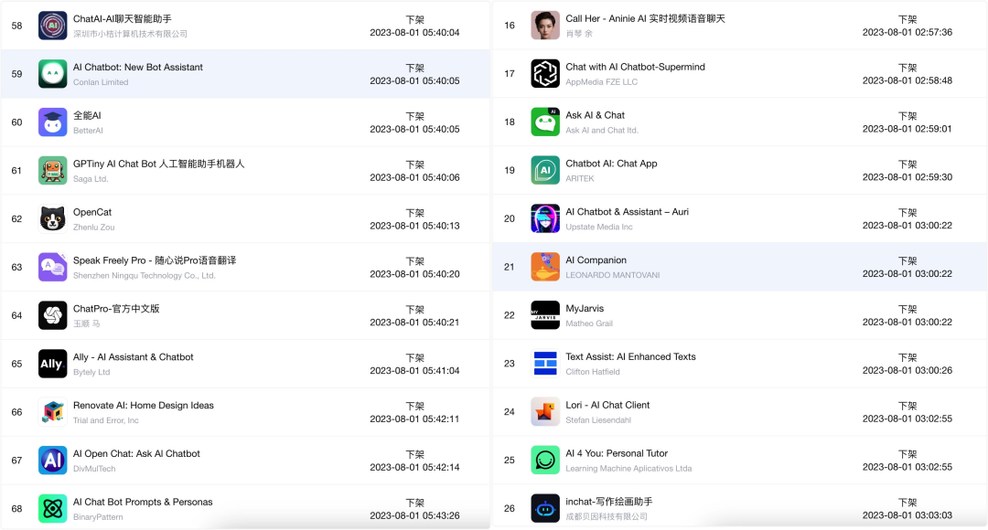 目前,基于《暂行办法》的 AI 规范已经有所动作:7 月 31 日,中国区 App Store 中大量提供 ChatGPT 服务的应用被苹果集中下架,并未提供直接 ChatGPT 访问、但同样主打 AI 功能的另一批 App 则暂时不受影响。