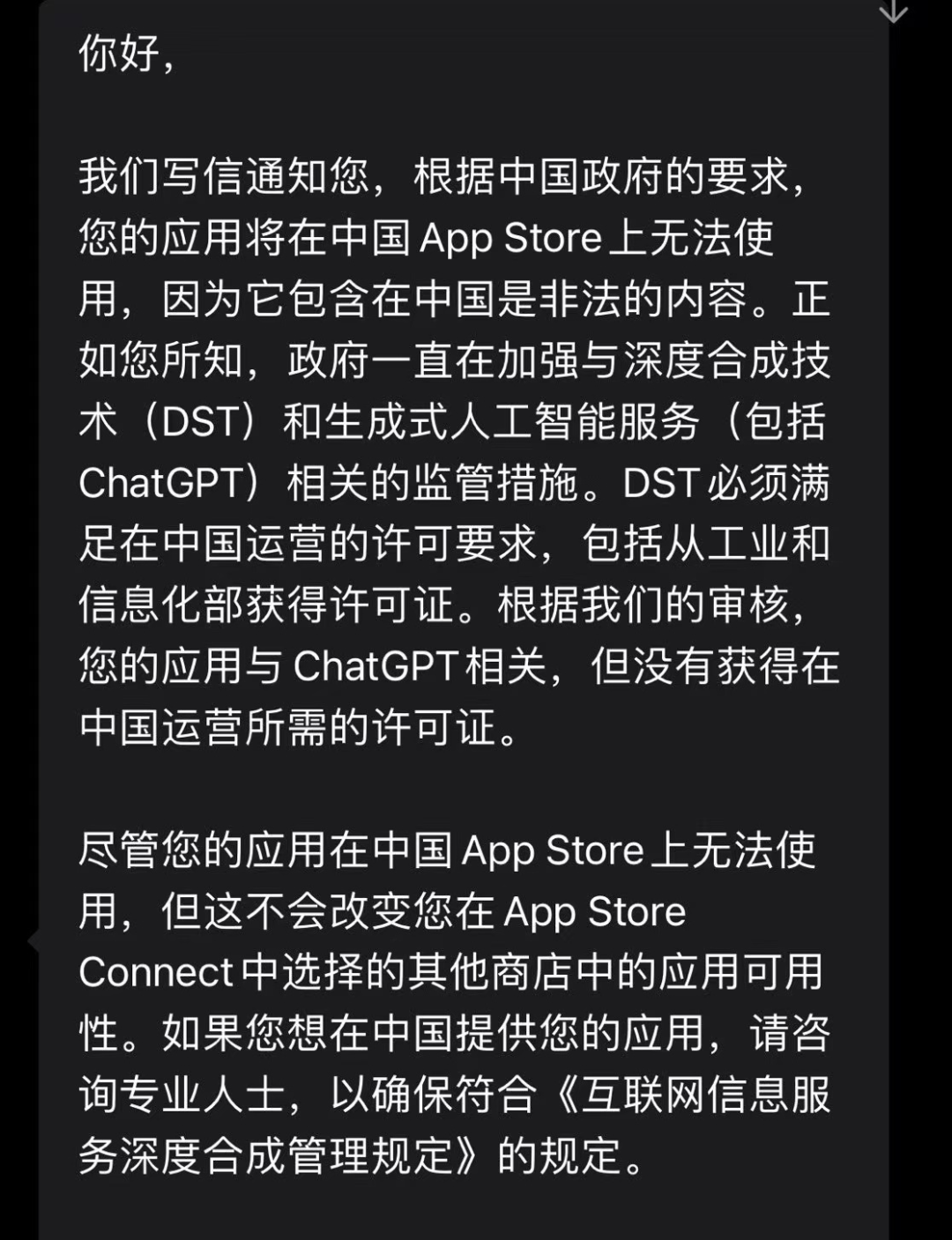 7月31日,苹果中国区App Store中的chatgpt产品集体下架,根据苹果的说法相关产品需要获得运营许可证。