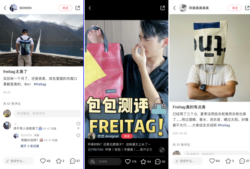 另一方面,新中产标识之下,一些产品上的缺点,反而构成了特定圈层的“优越感”。进一步帮助品牌传播。正如始祖鸟水洗后GTX面料容易受损,正如barbour风衣需要时长上蜡才能保持防雨效果,而到Freitag这里,如何散味,如何磨损后更好看,都成了消费者热烈讨论的社交货币。