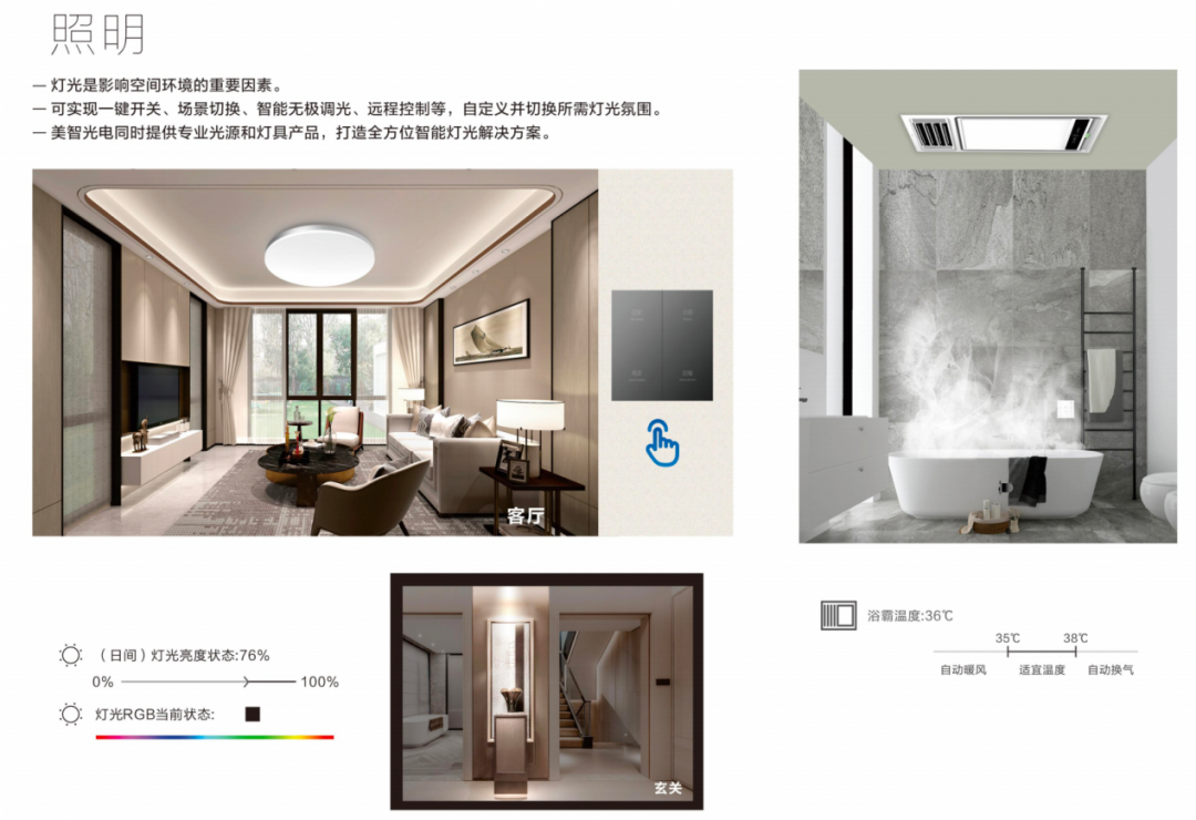 公司主要有照明、智能前装两块业务。其中,照明产品主要包括吸顶灯、厨卫灯、浴霸、台灯、筒射灯等;智能前装产品主要涵盖智能面板、智能门锁、智能网关等类别。