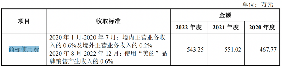招股书显示,2020年1月-2020年7月,美智光电按照境内主营业务收入的0.6%及境外主营业务收入的0.2%向美的集团(由美的暖通代收)支付商标使用费;2020年8月-2022年12月,按照使用美的品牌进行商品销售产生收入金额的0.6%向美的集团支付商标使用费。