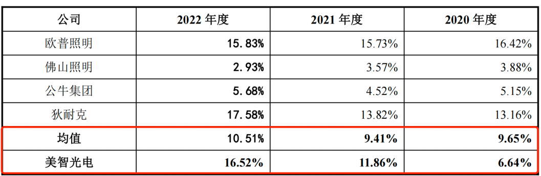 同行可比上市公司的销售费用率均值分别为9.65%、9.41%和10.51%,美智光电的销售费用率远远超过同行公司均值。