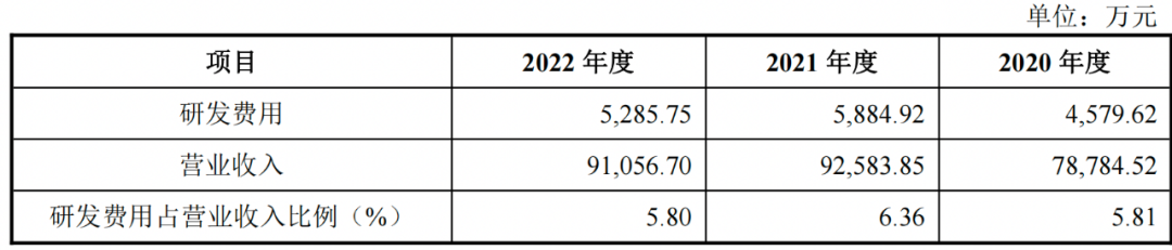 报告期内,美智光电的研发费用分别为4579.62万元、5884.92万元和5285.75万元,占营业收入比例分别为5.81%、6.36%、5.80%,研发费用率呈明显下滑趋势。