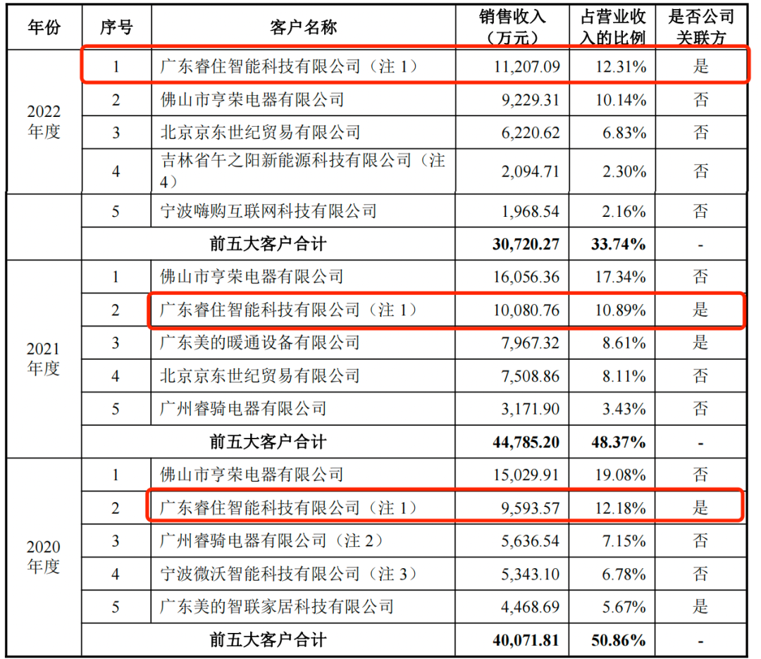 其中,广东睿住是美智光电的前五大客户之一。报告期内,美智光电对睿住智能的销售金额分别为9593.57万元、1.01亿元和1.12亿元,占当期营业收入的比例为12.18%、10.89%和12.31%。