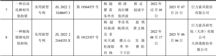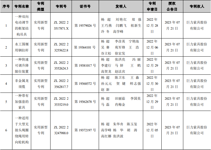 巨力索具8月1日公告,公司8月1日收到中华人民共和国国家知识产权局授予的8项实用新型专利证书。