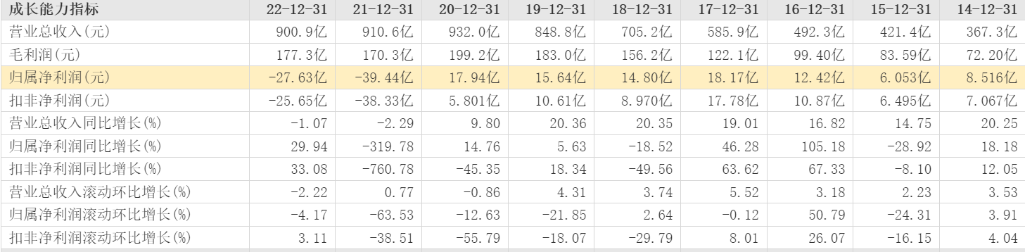 2022年情况也不太妙。营收依然在下滑,同比降了1.07%,亏损也在继续,当年归属净利润为-27.63亿元,同比增长29.94%。