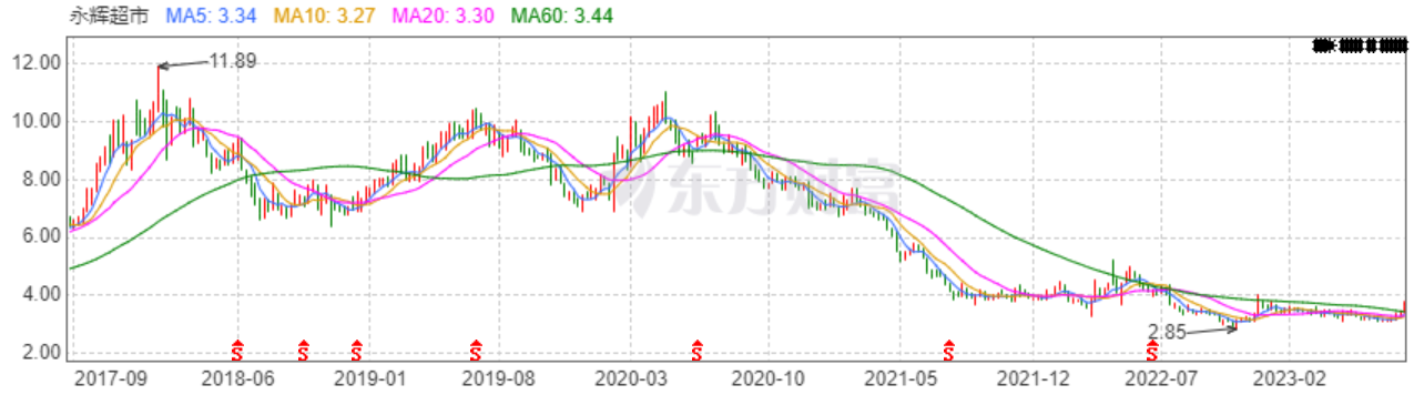 先说永辉超市这边,作为曾经的大白马,这2年活得似乎有点憋屈,这从下图的股价走势里可以窥见一二。