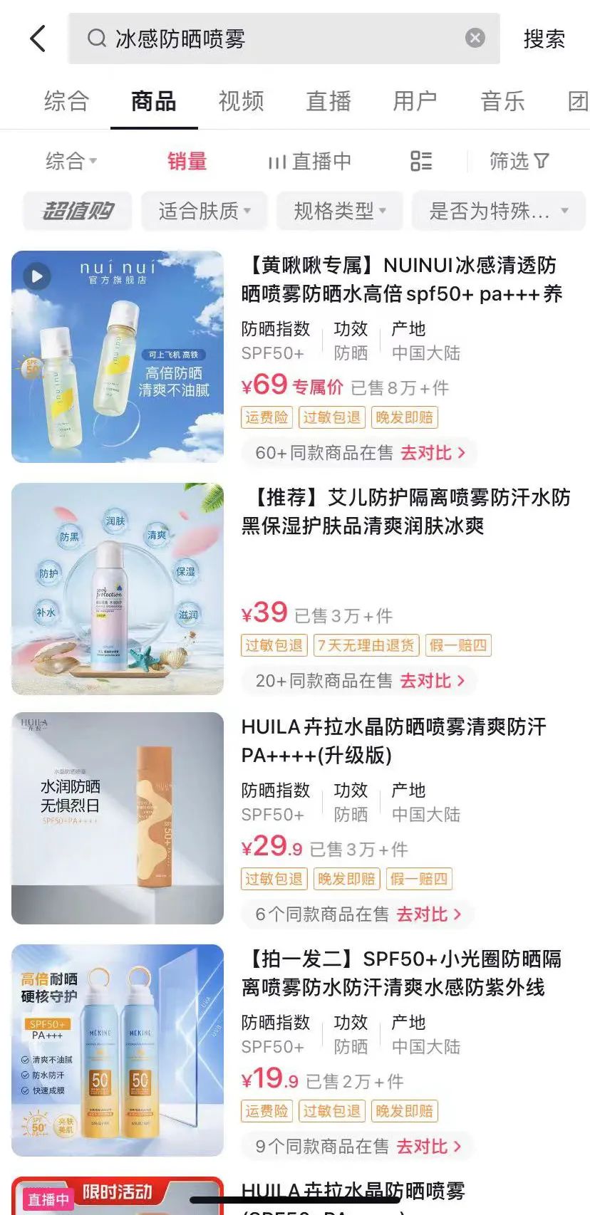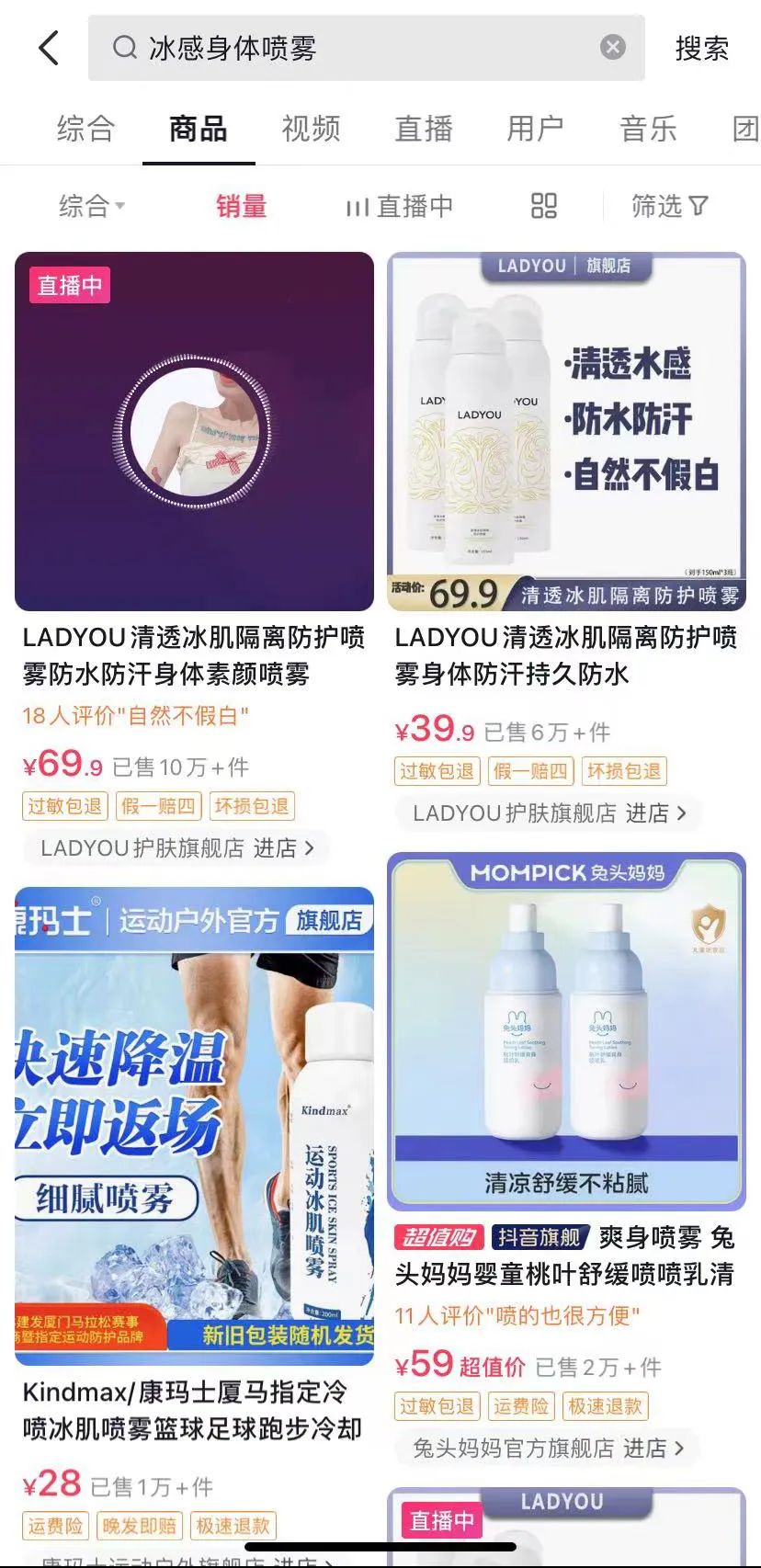 据蝉妈妈数据显示,近30天抖音平台“冰感”相关护肤产品销售额近750W,涉及品类包括但不限于防晒、面膜、面霜、喷雾、沐浴露、身体乳等,且相关产品销量极为可观。