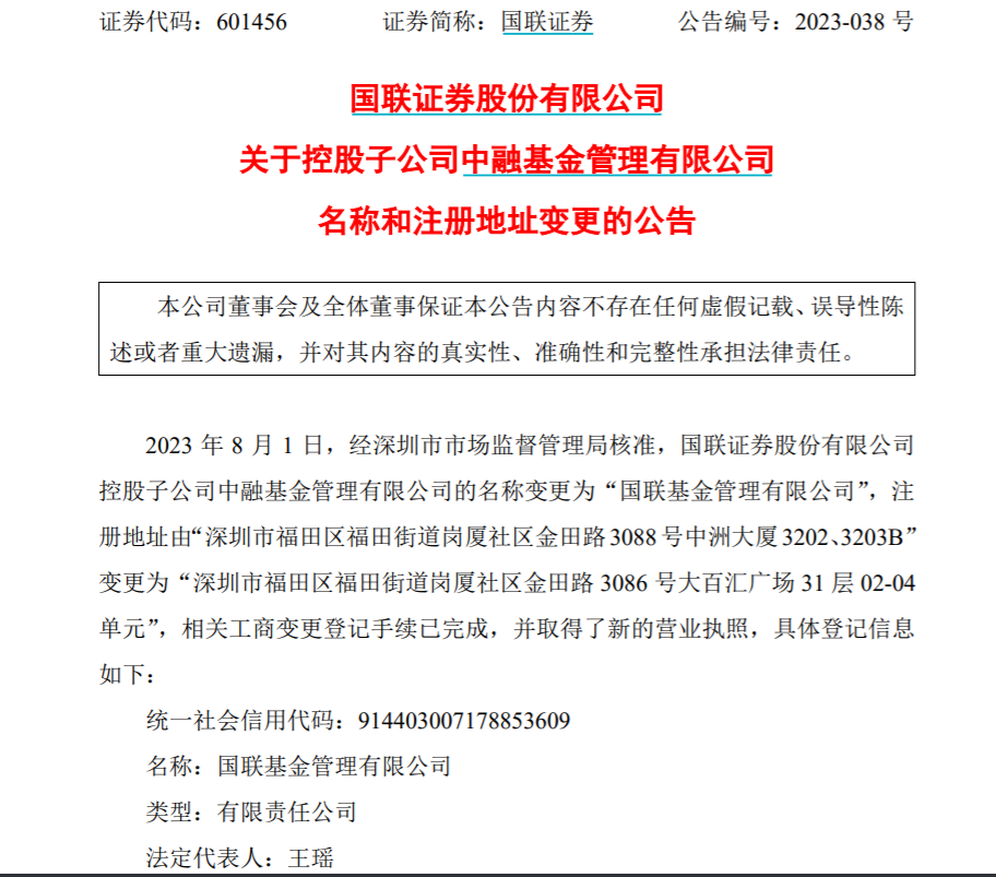 8月1日,国联证券(601456.SH)发布公告称,经深圳市市场监督管理局核准,国联证券控股子公司中融基金的名称变更为“国联基金管理有限公司”(简称“国联基金”),相关工商变更登记手续已完成,并取得了新的营业执照。