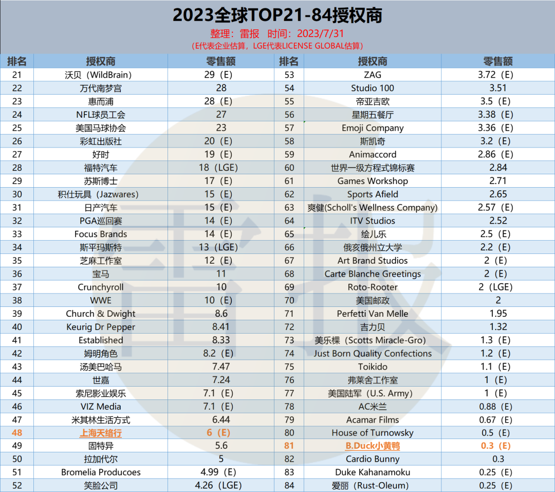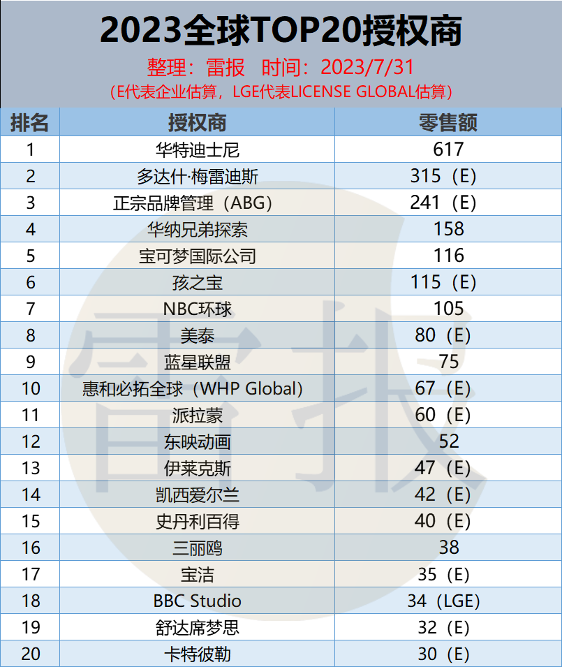 近日,全球授权展旗下授权行业杂志《LICENSE GLOBAL》发布了《2023年全球顶级授权商排行榜》,雷报对该报告进行了翻译和整理。
