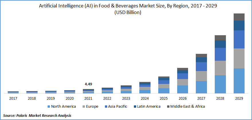 当然,人工智能的意义绝不仅在于为日常办公和生活饮食提供帮助。Foodaily看到:AI在辅助产品开发、提高生产效率、管理安全风险上的应用案例也日渐增多。Polaris Market Research的数据表明,2021年,全球人工智能在食品和饮料市场的价值为44.9亿美元,预计在预测期内将保持45.4%的年均增长率。