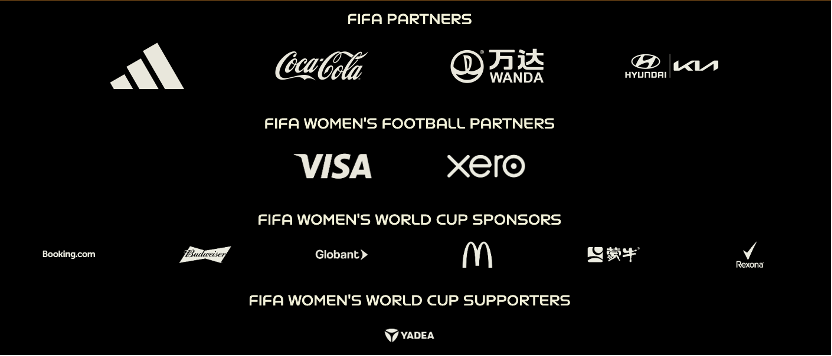 本届女足世界杯,我们就可以清晰的看到这一层级的体现。女足世界杯的专属赞助达到了9个,分别是女足合作伙伴VISA、XERO;女足世界杯赞助商Booking、百威、Globant、麦当劳、蒙牛、Rexona;以及女足支持伙伴雅迪。