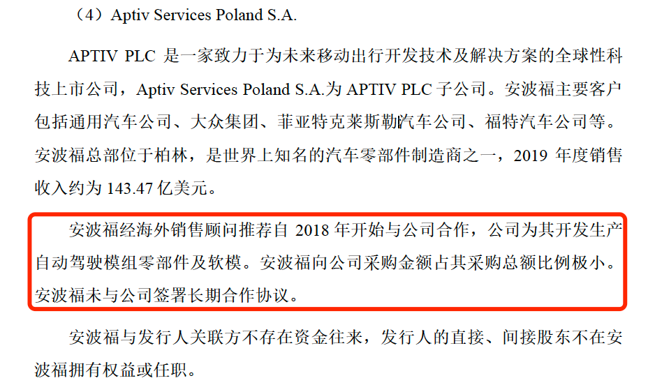 星源卓镁招股书报告期截至2022年6月。其显示,美股上市公司安波福为世界知名汽车零部件制造商,2018年开始,安波福经海外销售顾问推荐开始与星源卓镁合作,星源卓镁为其开发生产自动驾驶模组零部件及软模。安波福向公司采购金额占其采购总额比例极小,安波福未与公司签署长期合作协议。