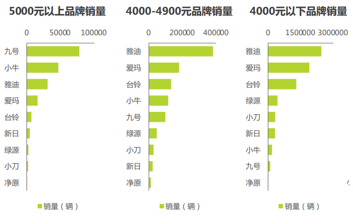 艾瑞咨询数据显示,在4000元以下、4000-4900元和5000元以上三个价位段,九号的排名分别为第八名、第五名和第一名。