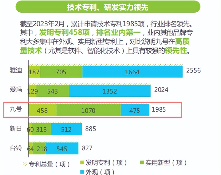 单看技术专利储备,九号公司仍落后于雅迪和爱玛两大两轮电动车巨头,但其在软件和智能化技术上有一定优势。