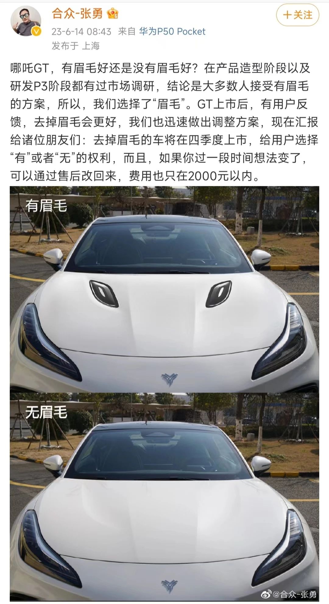 此后张勇也发了条微博,称在产品造型阶段以及研发P3阶段哪吒都有过市场调研,结论是大多数人接受有“眉毛”的方案。去掉眉毛的车将在四季度上市,给用户选择“有”或者“无”的权利,而且,如果用户过一段时间想法变了可以通过售后改回来,费用也只在2000元以内。