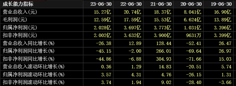 数据显示,2023年上半年,水井坊实现营收15.27亿元,同比下降26.38%;归母净利润2.028亿元,同比下降45.15%,可谓业绩“双降”。拉长周期来看,这份半年报是近5年来第二差的中报,仅次于受疫情影响的2020年。