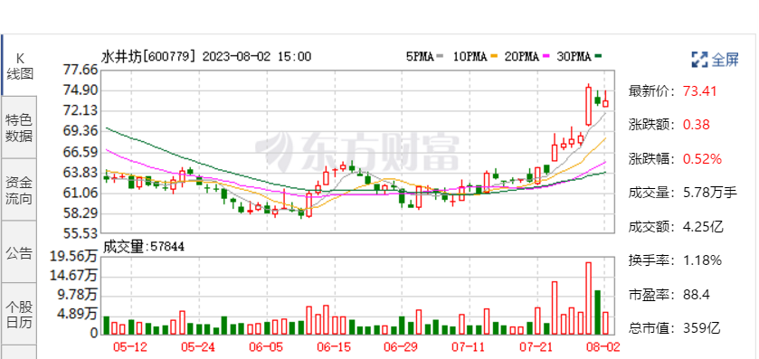 7月31日,水井坊股价跳空高开,不到7分钟就封住涨停,成为白酒板块当日的领涨股。虽然盘中打开涨停,但收盘依旧大涨9.51%,成交金额也放大到13.6亿元。