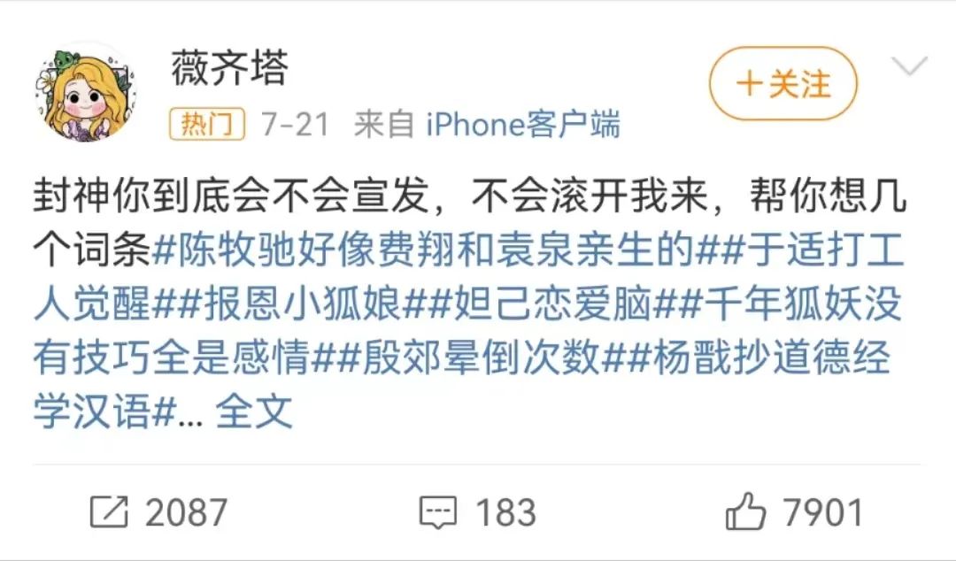 这批人开始在微博上为宣发出谋划策,@薇齐塔 一连帮影片想了二十个词条,甚至有IP澳大利亚的@CUPC8KE 在官博评论区,教片方如何造梗买热搜,「豆瓣开分7.7,中国电影奇幻类历史最高分,封神纣王费翔PUA鼻祖,黄渤率领封神地三鲜小分队」。