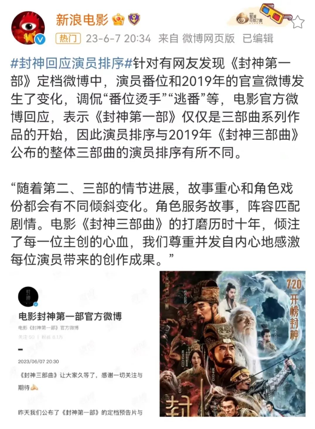 《封神》官方在6月7日做出回应,解释2019年宣布的番位是《封神三部曲》的排序,如今是按第一部戏份不同而排列。费翔、黄渤也分别转发,表示演员排位会根据故事相应调整。