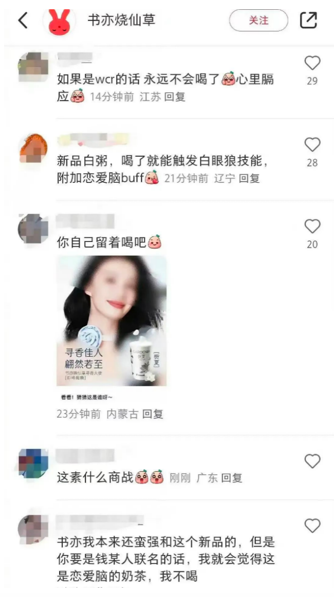 热剧主角通常都能接到新的商务,而到了王楚然这边,书亦烧仙草才释出一份预告物料,评论区便一片抵制声,直到商家删帖。