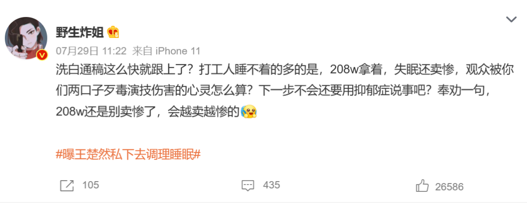 王楚然这次也一样。商务刚遭抵制,#王楚然做错了什么#、#曝王楚然私下调理睡眠#等词条已经空降热搜。资深吃瓜人一眼认定这是在卖惨、倒打一耙、按头网暴,自然不会认,反而决心战斗到底。
